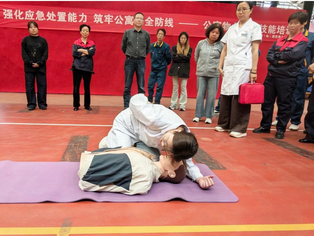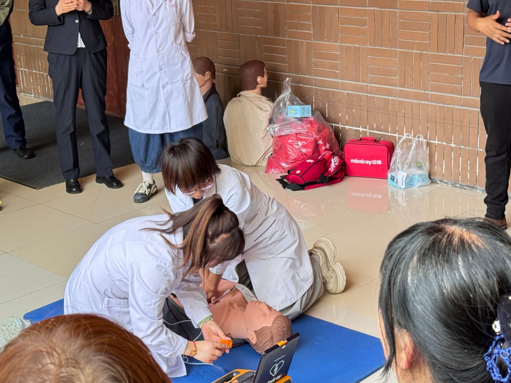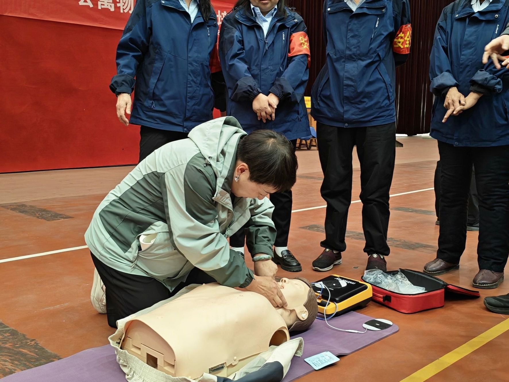 实操教学环节是本次培训的重点。培训医师结合公寓应急处置实际,现场逐一演示了心肺复苏(CPR)操作流程、自动体外除颤器(AED)使用步骤、海姆立克急救法以及三角巾绞棒包扎止血法等关键急救技能,细致讲解各项操作的动作要领、注意事项与常见误区,确保参训人员精准把握操作标准。演示完毕后,参训人员分组开展实操演练,医师团队全程一对一现场指导,针对按压位置、按压深度、通气频率、AED电极片粘贴、异物冲击手法等关键细节逐一纠正,引导参训人员反复练习、熟练运用,切实提升全体学员规范、高效的应急施救能力。