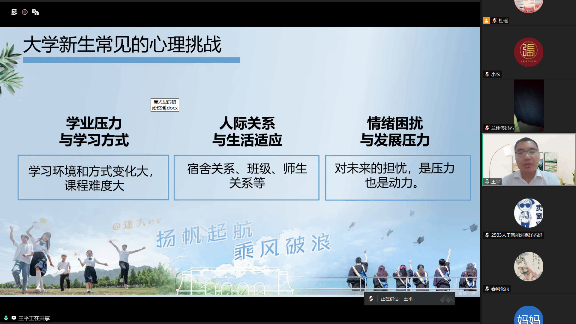 为全面落实立德树人根本任务,深化家校协同育人机制,进一步凝聚育人合力,助力新生尽快适应大学生活,开启成长新征程。我院于9月9日线上召开2025级本科生新生家长会。学院党委副书记、副院长米泽龙,副院长李智杰,学校心理素质拓展与咨询中心王平老师出席会议,2025级本科生辅导员杜瑶主持,近500 名新生家长云端参会。
