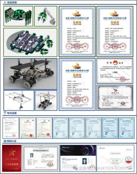 在创新创业的广阔舞台上,姜飞同样展现出了非凡的才华。他带领团队成员,积极参与各类创新创业竞赛,屡获佳绩,荣获国家一等奖一项、二等奖三项,陕西省一等奖四项、二等奖两项,以及十余项校级奖项。他结合自己参军的演习经历,设计了一款基于数据驱动、面向丛林作战的侦察蜘蛛机器人,在全国三维数字化创新设计大赛决赛中荣获全国最佳工业模型奖。此外,他还申请获得发明专利一项、实用新型专利三项、软件著作权三项,以及国家优秀大创项目一项。这些成果的产出,充分展现了他的创新能力、领军能力和实践能力。